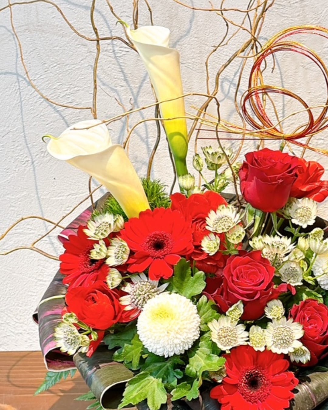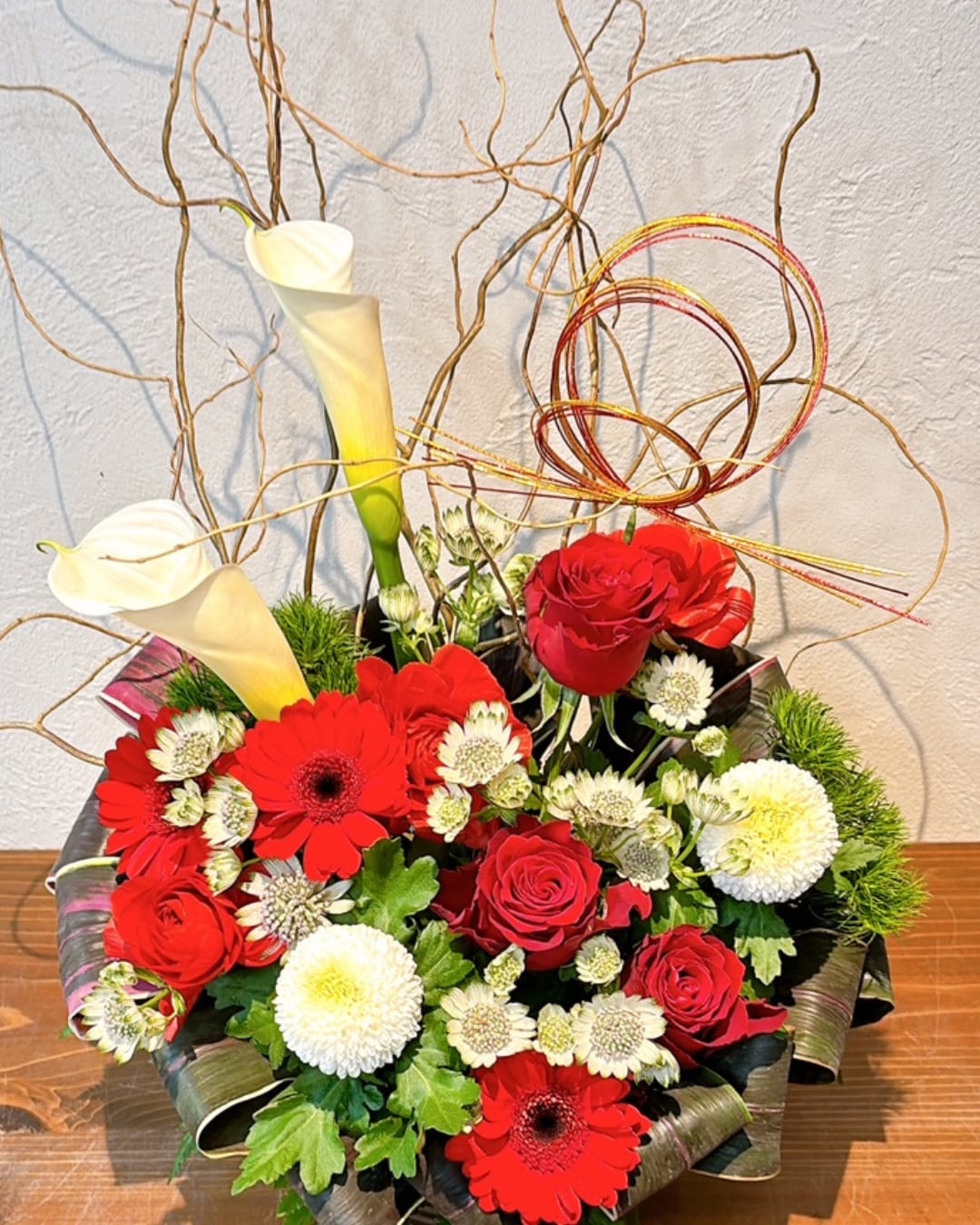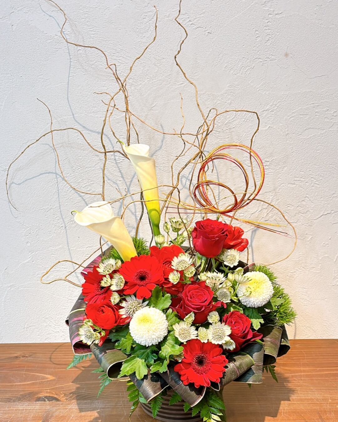 ● 使用花材:カラー、バラ、ガーベラ、マム、枝もの、グリーンなど