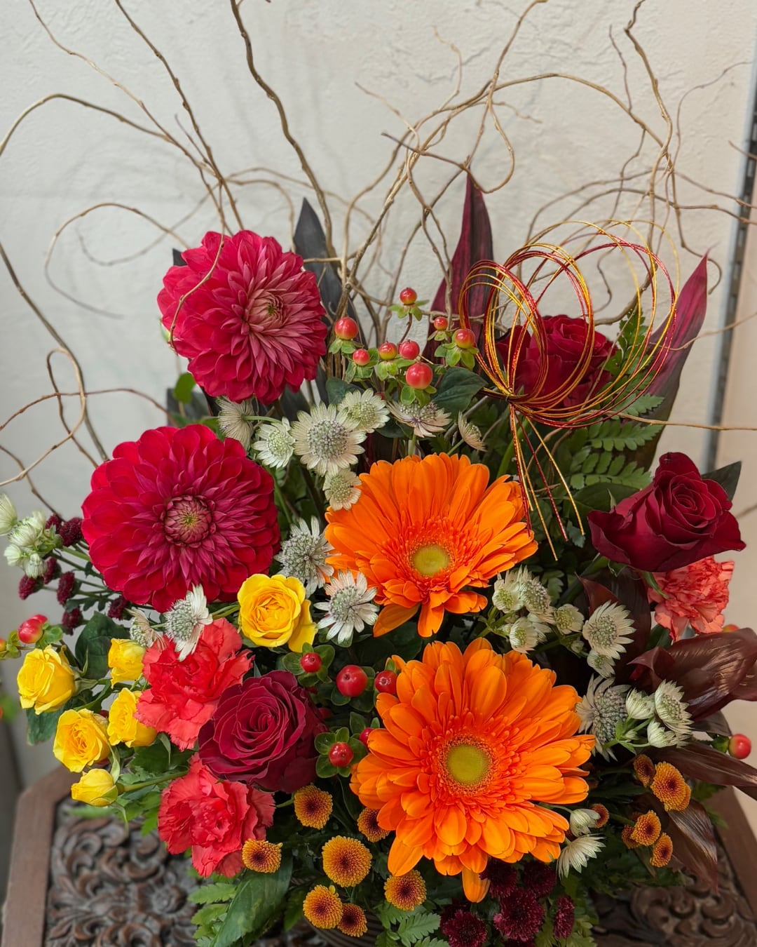 深紅のダリアやバラ、オレンジのガーベラ、